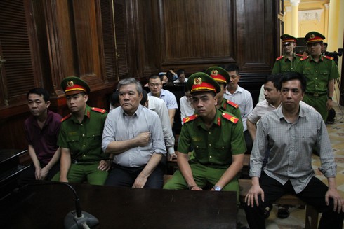 Bị cáo Phạm Văn Thông (ngồi giữa) trong ngày xét xử đầu tiên. |