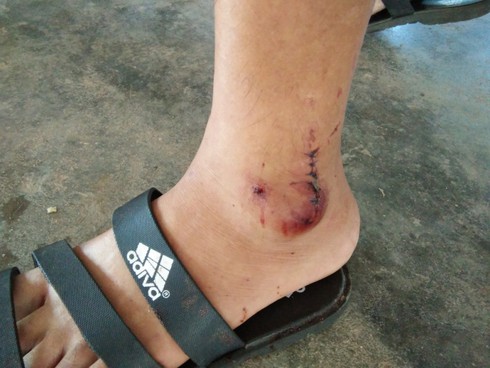 Vết khỉ cắn ở chân làm trung tá công an mất nhiều máu, và phải khâu 6 mũi. |