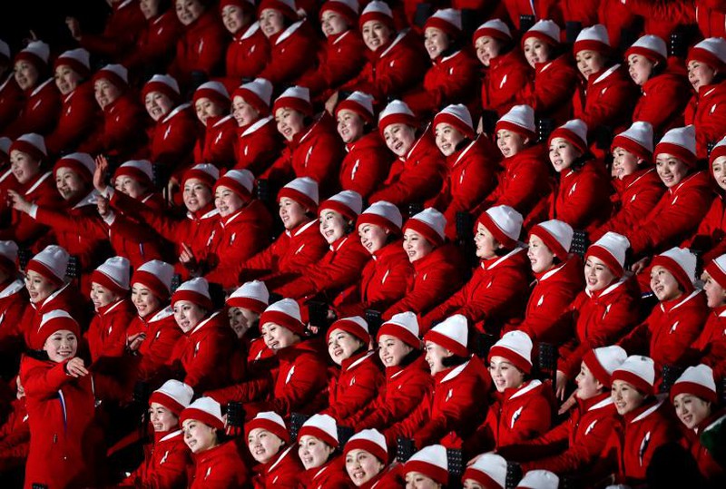 Các cô gái trong đội cổ vũ đến từ Triều Tiên gây chú ý trong buổi lễ khai mạc của Thế vận hội mùa đông Pyeongchang 2018 tại Hàn Quốc. |