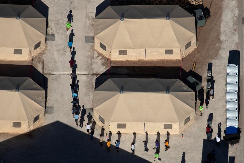 Những đứa trẻ di cư xếp hàng di chuyển giữa các lều tại một cơ sở tập trung gần biên giới Mexico ở Tornillo, bang Texas, Hoa Kỳ. Ảnh chụp ngày 18/6/2018. |