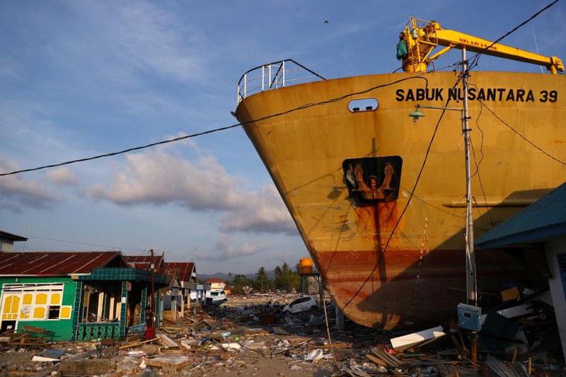 Một con tàu lớn mắc cạn sau trận động đất, sóng thần lớn đổ bộ vào Wani, Donggala, trung tâm Sulawesi, Indonesia ngày 3/10. |