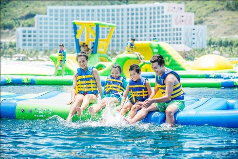 Các thành viên gia đình cùng tham gia những trò chơi độc đáo trên Vịnh Phao Nổi(Ảnh: Vinpearl Land) |