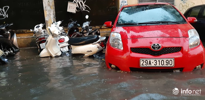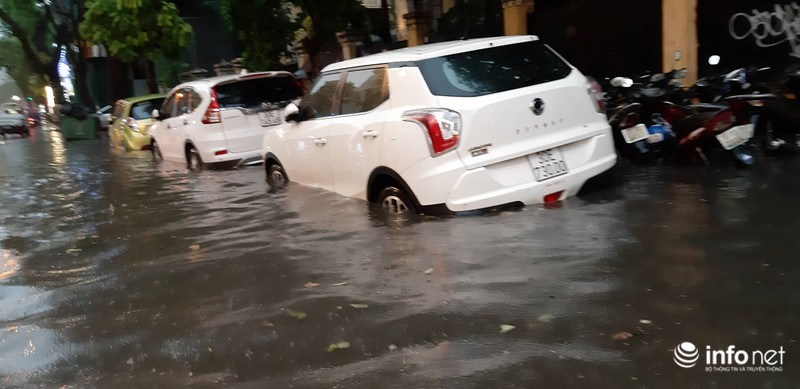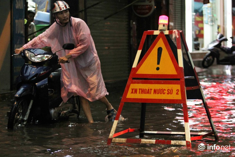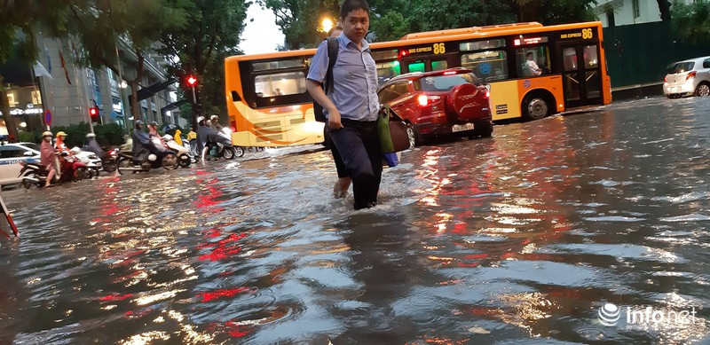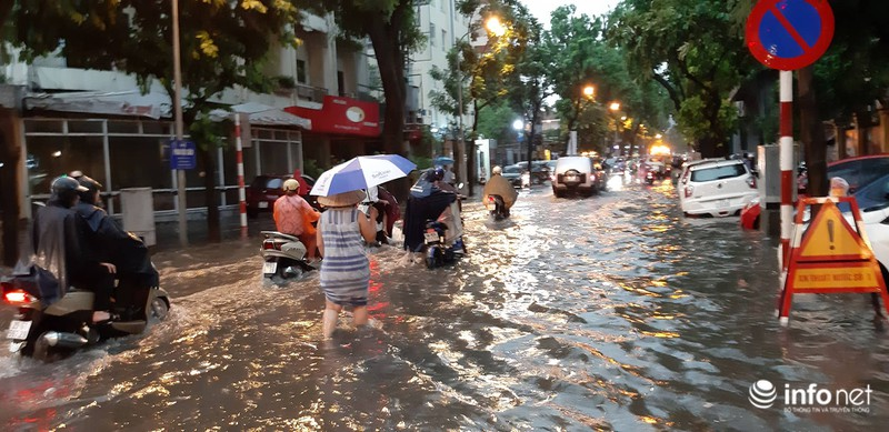 Ghi nhận của PV Infonet, trên phố Lý Thường Kiệt (Quận Hoàn Kiếm), cơn mưa kéo dài khoảng gần 1 tiếng gây ngập từ 20-30cm, khiến người và xe cộ di chuyển khó khăn. Một số xe bị chết máy, người dân phải dắt bộ lội bì bõm trong làn nước bẩn đen ngòm.