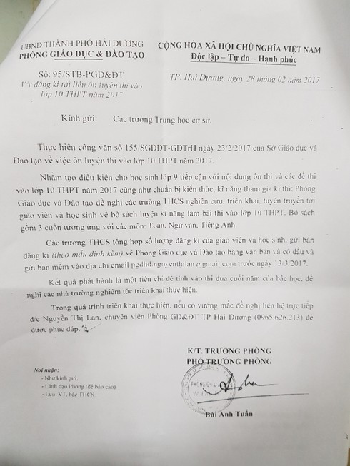 Cụ thể, trong văn bản do ông Bùi Anh Tuấn - Phó trưởng Phòng Giáo dục & Đào tạo TP. Hải Dương ký có nêu rõ “Nhằm tạo điều kiện cho học sinh lớp 9 tiếp cận với nội dung ôn thi và các đề thi vào lớp 10 THPT năm 2017 cũng như chuẩn bị kiến thức, kỹ năng tham gia kỳ thi, Phòng GD&ĐT đề nghị các trường nghiên cứu, triển khai, tuyên truyền tới giáo viên, học sinh về bộ sách luyện kỹ năng làm bài thi vào lớp 10 THPT. Bộ sách gồm 3 cuốn tương ứng với các môn: Toán, Ngữ Văn và Tiếng Anh.