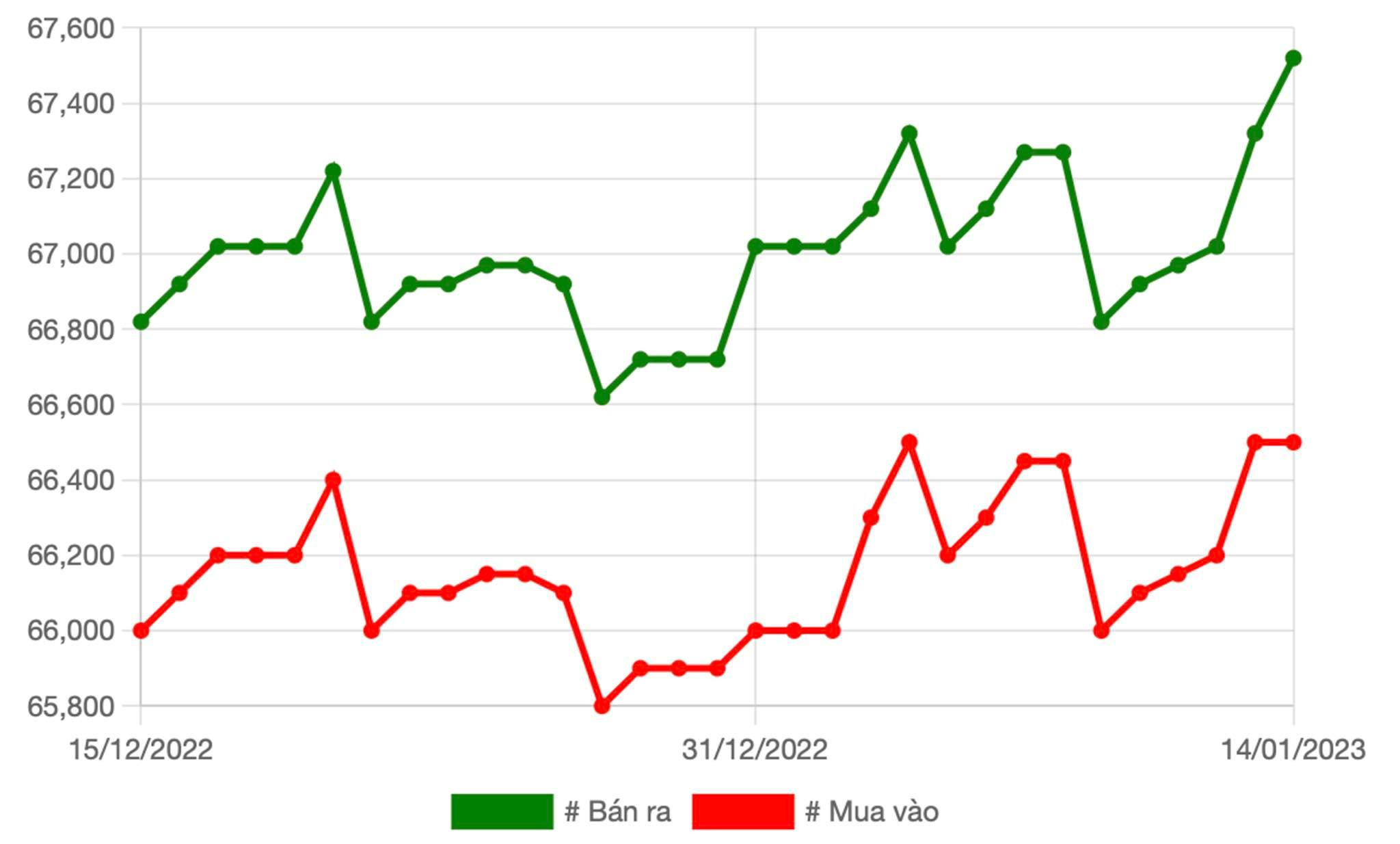 Giá vàng bắt đầu tăng trở lại theo đà tăng của thế giới từ phiên 13/1. Giá vàng miếng 9999 tại SJC TP.HCM là 66,3 triệu đồng/lượng (mua vào) - 67,12 triệu đồng/lượng (bán ra). SJC Hà Nội niêm yết ở mức 66,3 triệu đồng/lượng (mua vào) và 67,1 triệu đồng/lượng (bán ra).