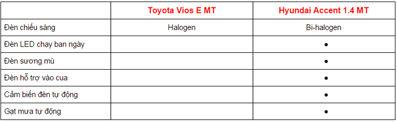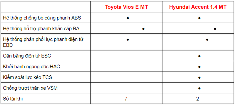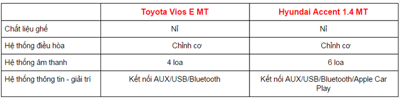 Hyundai Accent 1.4 MT tuy có giá rẻ hơn 61 triệu nhưng danh sách trang bị lại nhỉnh hơn hẳn Toyota Vios E MT. So với các đối thủ số sàn khác trong phân khúc thì Accent cũng gần như đứng đầu về option. Kết hợp với thiết kế hiện đại, trẻ trung, mẫu sedan Hàn Quốc phù hợp với khách hàng trẻ, mong muốn giảm nhẹ chi phí mua xe, không quan tâm đến vấn đề thương hiệu và giá trị bán lại mà chú trọng hơn về phương diện tiện nghi.