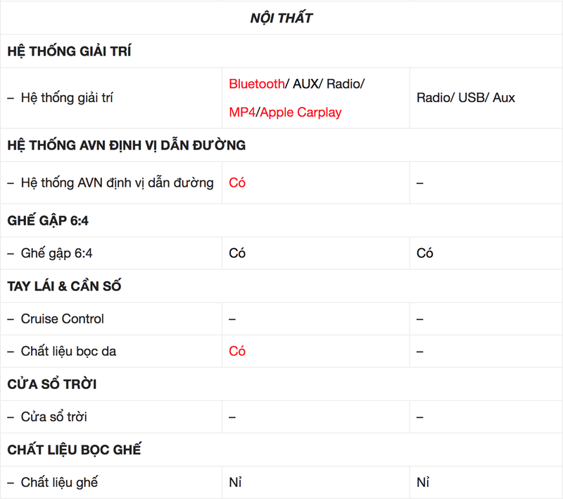Tất cả các phiên bản đều chỉ trang bị ghế lái chỉnh tay 6 hướng và ghế hành khách chỉnh tay 4 hướng. Các phiên bản đều tính năng gập phẳng theo tỉ lệ 60:40 giúp tăng dung tích không gian hành lý khi cần thiết.