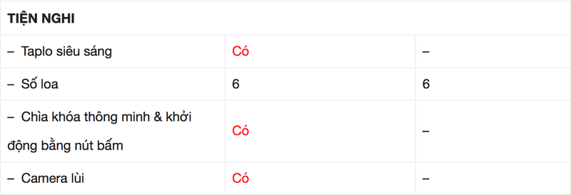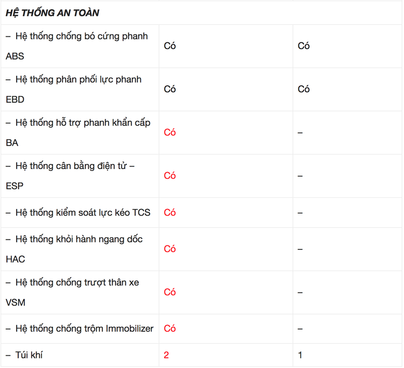 Bảng so sánh trang bị của Accent phiên bản số sàn tiêu chuẩn và cao cấp. |