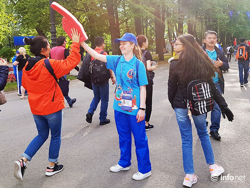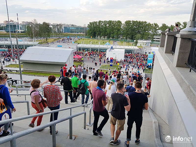 Các tình nguyện viên trong trang phục màu xanh nước biển (một trong ba màu của Quốc kỳ Nga) rất nhiệt tình chào đón, hướng dẫn khán giả vào các khu vực của SVĐ Zenit Arena. |