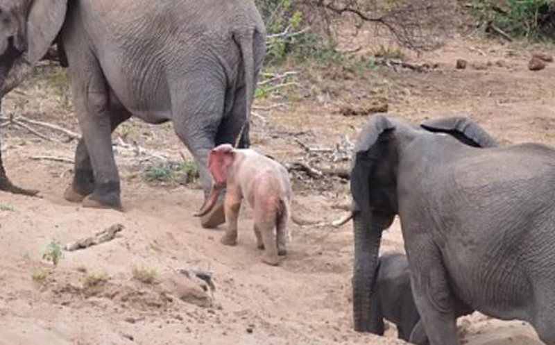 Theo tờ satourismonline, khách du lịch phát hiện đàn voi đang uống nước ở gần sông Shingwedsi, Vườn quốc gia Kruger, Nam Phi. Trong đàn có một con voi nhỏ màu hồng nhạt khác biệt với những con còn lại trong đàn.