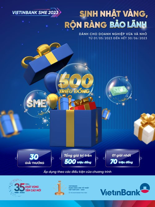 Năm 2023 là một năm đặc biệt trong hành trình phát triển của VietinBank, đánh dấu Ngân hàng chính thức đón sinh nhật lần thứ 35. Để chào mừng sự kiện ý nghĩa này, VietinBank dành tặng tất cả các khách hàng doanh nghiệp sử dụng dịch vụ phát hành bảo lãnh với mức phí từ 10 triệu đồng trở lên, có sử dụng dịch vụ ngân hàng số VietinBank eFAST cơ hội tham gia Chương trình quay số trúng thưởng “Sinh nhật Vàng, Rộn ràng Bảo lãnh”. Trị giá giải thưởng lên đến hơn 500 triệu đồng.