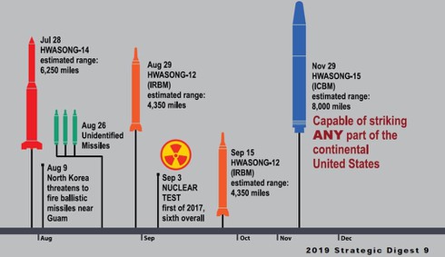 Cũng theo "2019 Strategic Digest", Triều Tiên đang sở hữu 2 loại ICBM là Hwasong-13 có tầm bắn hơn 5.500 km và Hwasong-14 có tầm bắn 12.874 km đủ khả năng đưa toàn bộ lãnh thổ Mỹvào phạm vi tấn công. Triều Tiên đã phóng thử tên lửa Hwasong-14 vào ngày 4/7/2017.