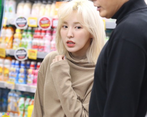 Nữ ca sĩ có làn da trắng mịn và nổi bật với mái tóc màu bạch kim. Cô cùng quản lý tới siêu thị mua đồ rồi nhanh chóng trở lại khách sạn. Chỉ một mình cô mua đồ mà không có các thành viên còn lại của Red Velvet. |