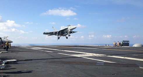 Một máy bay F/A-18 hạ cánh xuống tàu sân bay USS John C. Stennis của Mỹ khi tàu này còn hoạt động ở biển Đông. |