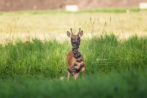 Julie Carrow chia sẻ hình ảnh trên mạng xã hội Facebook và nhanh chóng thu hút được sự chú ý. Những bức ảnh cho thấy nhiều khối u to nhỏ đang phát triển xâm chiếm hết bề mặt cơ thể con nai: thân, miệng, mặt và thậm chí khối u lớn đang che dần một bên mắt của nó.