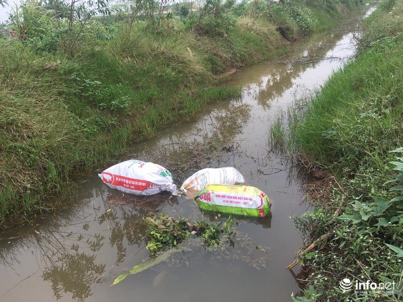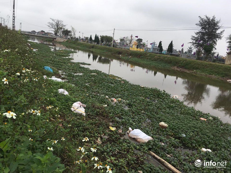 Cả một đoạn sông Ninh Hải chất đầy những bao đựng xác lợn chết ven sông. |