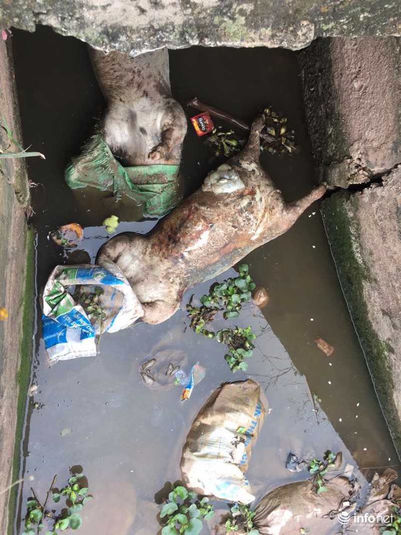 Xác lợn chết bị dồn tại cửa cống và đang phân hủy gây ô nhiễm nghiêm trọng. |