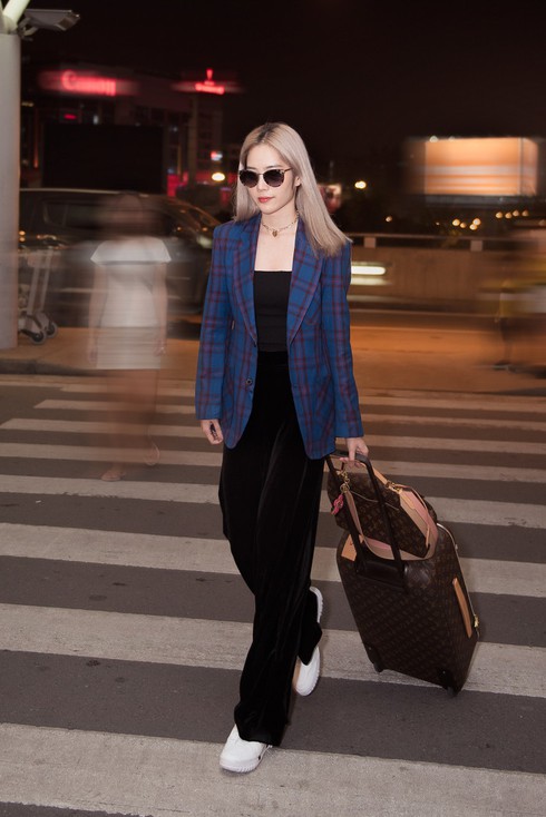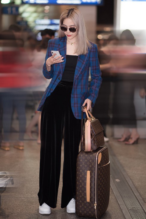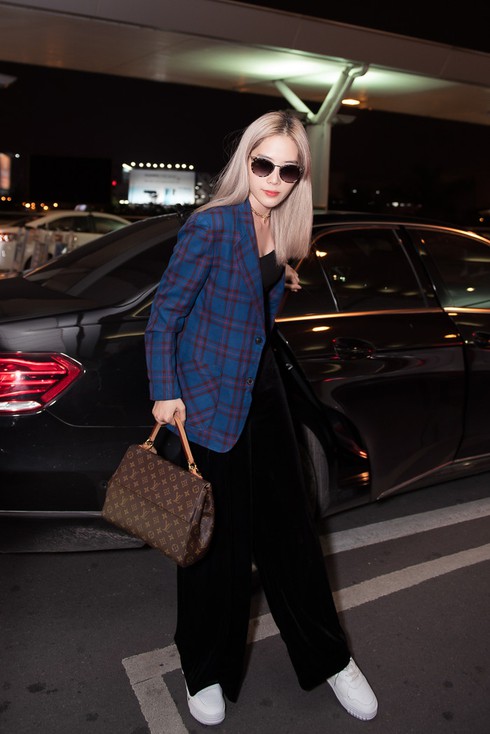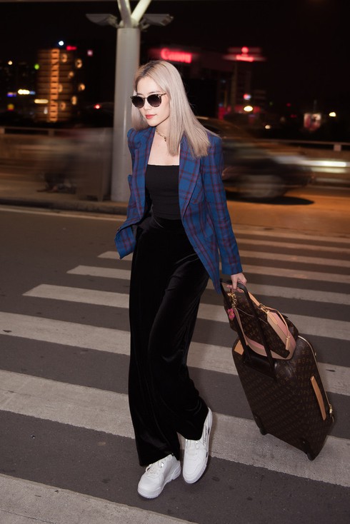 Vừa mới đến sân bay, Nam Em đã nhanh chóng thu hút sự chú ý của nhiều người bởi ngoại hình nổi bật. Người đẹp chọn cho mình phong cách menswear cá tính với cách phối đồ đơn giản nhưng không kém phần thời trang. Diện áo hai dây, quần ống rộng và giày thể thao khá thoải mái, cô nàng khéo léo mix cho mình chiếc áo khoác blazer sọc xanh khiến tổng thể trở nên nổi bật và hút ánh nhìn hơn.