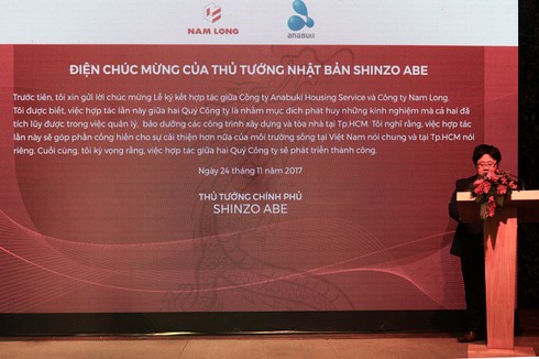Ông Omori Daisuke (Giám đốc Chiến lược Tập đoàn Anabuki) lên đọc công điện chúc mừng của Thủ tướng Nhật Bản Shinzo Abe về sự hợp tác của Nam Long và Anabuki. |