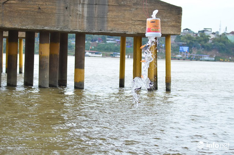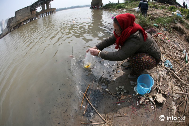 Tục thả cá chép được thực hiện vào ngày 23 tháng Chạp hàng năm, đây là tục lệ cổ truyền lâu đời của người Việt Nam. Ở địa điểm dưới chân cầu Long Biên, người dân không chỉ thả cá mà còn thả cả chân hương, tro hóa vàng... xuống dòng nước. |