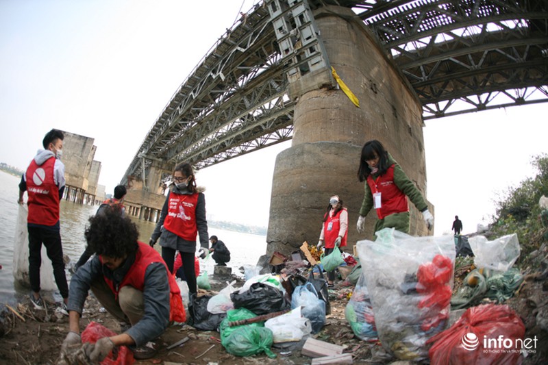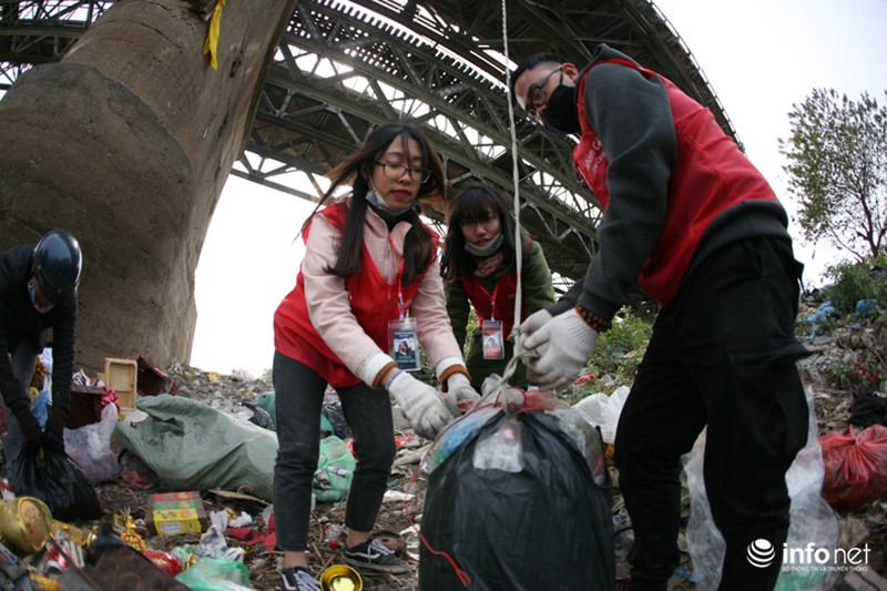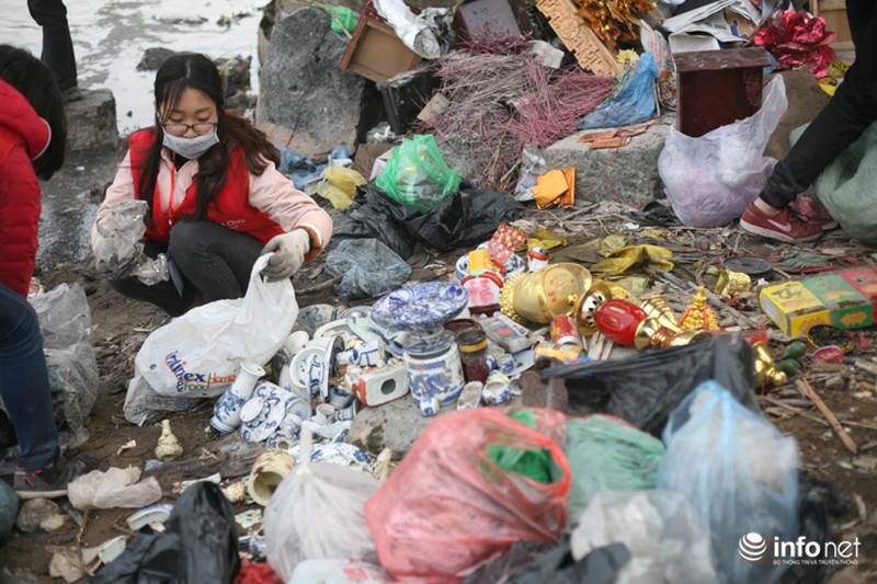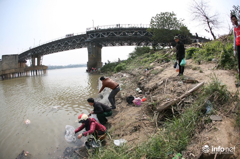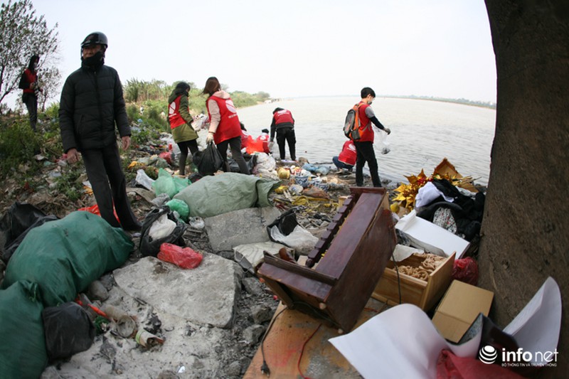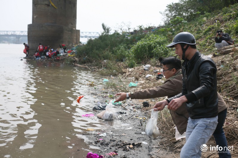 Ngay dưới chân cầu, các bạn trẻ trong đội tình nguyện cá chép với khẩu hiệu "Thả cá đừng thả túi nilon" túc trực để thu dọn rác khó phân hủy như túi nilon, gỗ, bàn thờ, ấm chén... |