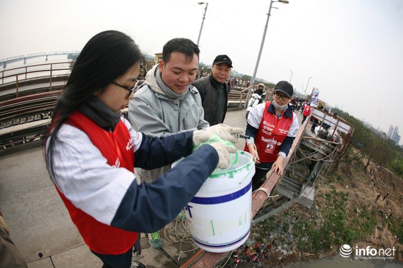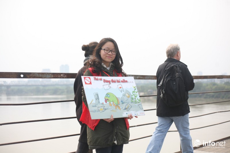 Các bạn trẻ cầm khẩu hiệu đứng dọc cầu Long Biên nhắc nhở người dân không thả túi nilon theo cá xuống nước. |