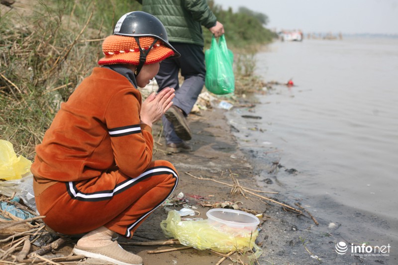 Những chú cá chép vàng, đỏ vốn quen với mực nước nông nên khi được thả ra sông chỉ bơi luẩn quẩn, mắc cạn gần bờ, ở ngay bên trên là đầy rẫy những tàn tro hóa vàng, chân hương. |