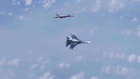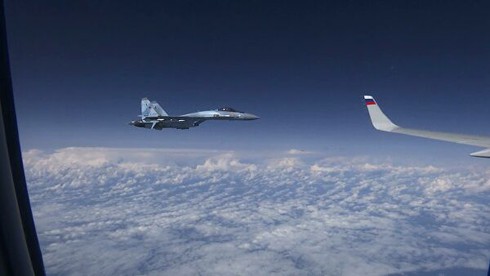 Tiêm kích S-27 Nga xua đuổi chiến đấu cơ F-18 NATO tiếp cận chuyên cơ chở Bộ trưởng Quốc phòng Nga Shoigu trên biển Baltic. Ảnh Ria |