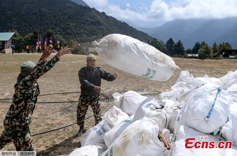Binh lính Nepal đang ném những túi chất thải được thu thập từ đỉnh Everest tại Namche Bazar, vào ngày 27/5/2019. |