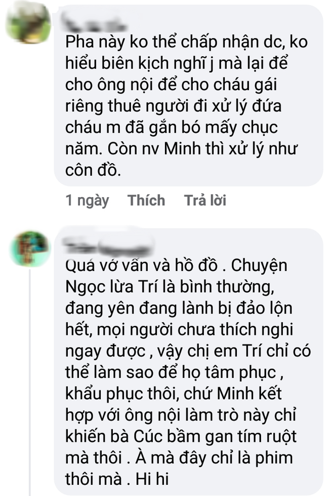 Cụ thể, phần lớn khán giả không đồng ý với chuyện phim xây dựng hình tượng nhân vật Minh (do Thu Trang thủ vai) tự cao, mưu mô và có phần hống hách trong cách đối xử với Ngọc (Quỳnh Kool) và chính thất là bà Cúc (NSND Thu Hà). Còn về phần bà Diễm Loan (Vân Dung), dù ở hoàn cảnh nào hay bất kỳ lý do gì, thì chuyện bà Loan chen chân vào phá hoại gia đình người khác cũng là hành vi sai trái, đã thế, cô ả còn lên mặt tự đắc với danh phận "tiểu tam" đi vòi tiền gia đình chính thất, định giá "con riêng" rất ngang nhiên và tự mãn. Cao trào của "làn sóng" cổ xúy con riêng và tiểu tam trong phim, còn được đẩy lên đến đỉnh điểm ở tập 13, khi ông Phan (ông nội) đã liên minh công khai đứng về phe Minh để "xử đẹp" Ngọc vì tội lừa Trí (Đình Tú) chơi cá độ và bị bắt giam.