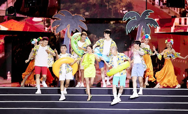 Văn Mai Hương khuấy động sân khấu với tiết mục Take me to the Sun. Giai điệu trẻ trung, vui tươi của bài hát, cùng sự kết hợp duyên dáng của vũ đoàn với đạo cụ là phao bơi, những bộ quần áo sắc màu khiến ai cũng muốn đến Phú Quốc ngay lập tức để đắm mình trong biển xanh và nắng vàng.