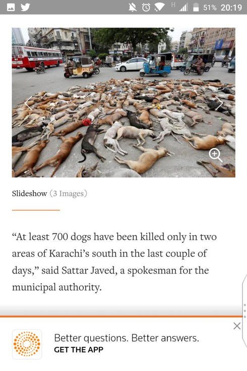 Cụ thể, Reuters đã có loạt bài tiết lộ cách thức hơn 700 chú chó hoang ở thành phố Karachi tại Pakistan bị theo dõi và đầu độc chỉ trong vài ngày. Hành động của chính quyền Karachi là nhằm giảm số lượng động vật đi hoang ở trên các con đường vào năm 2016.