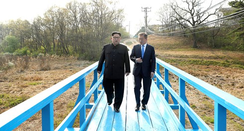 Lãnh đạo Triều Tiên Kim Jong-un và Tổng thống Hàn Quốc Moon Jae-in cùng nhau tản bộ tại làng hòa bình Panmunjom vào tháng 4 vừa qua. |