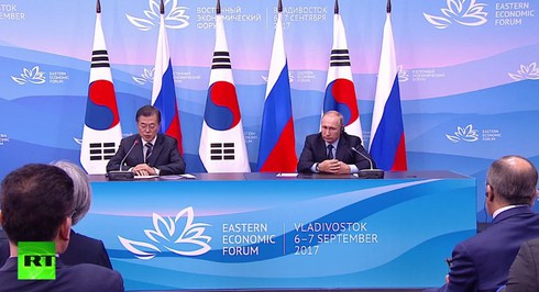 “Chúng tôi đã đồng thuận tăng cường cơ sở để triển khai các dự án 3 bên liên quan tới Hàn Quốc, Triều Tiên và Nga. Những dự án này là nhằm kết nối bán đảo Triều Tiên với vùng Viễn Đông của Nga”, RT dẫn lời ông Moon phát biểu sau cuộc họp với Tổng thống Nga Vladimir Putin tại Diễn đàn kinh tế phương Đông diễn ra ở thành phố cảng Vladivostok.