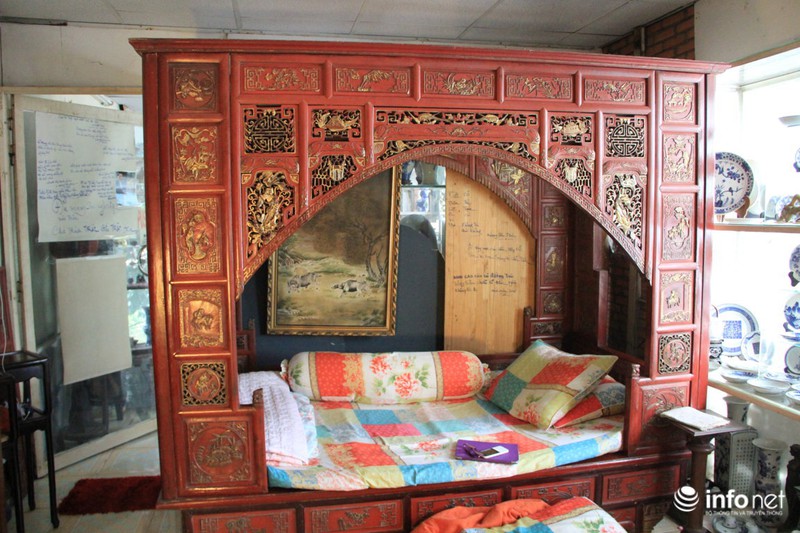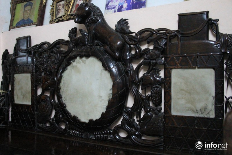 Kế đến là chiếc sập ba thành có tuổi đời hơn 300 năm, được làm nguyên miếng bằng gỗ lệ chi (cây vải), chạm khắc rất tinh xảo với hình con rồng đang ôm quả địa cầu. Giới sưu tầm đánh giá, chiếc sập có một không hai ở Việt Nam.