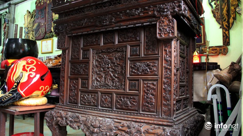 Đầu tiên phải kể đến, chiếc bàn thờ bằng gỗ hoàng hoa lý (gỗ sưa) được chạm khắc rất tinh xảo với nhiều hình rồng uốn lượn. Theo ông thì bàn thờ này có từ thời vua Khải Định, được vua dùng để cúng, tế trời, cầu an mưa thuận gió hòa.