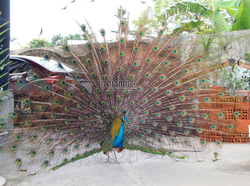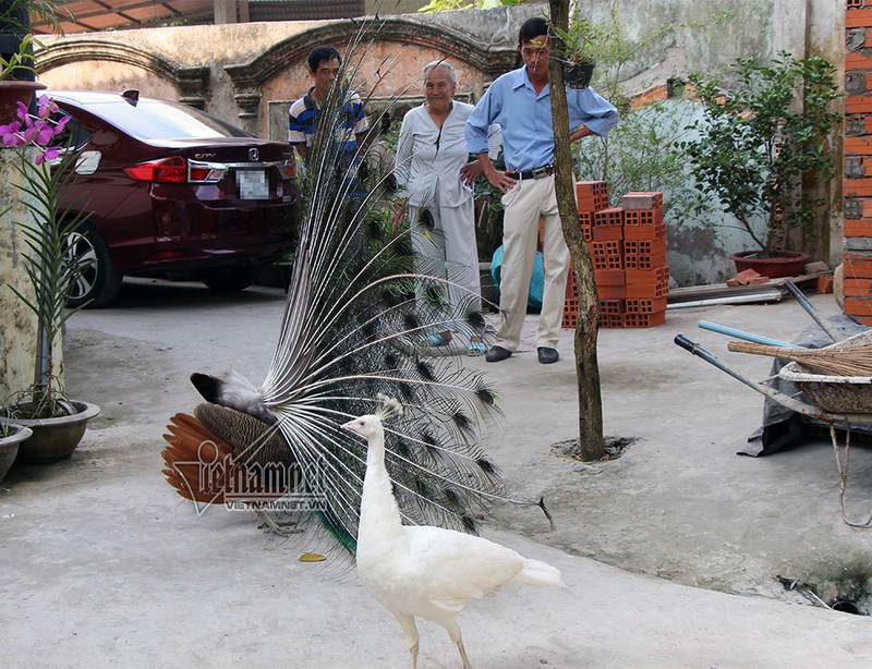 Đàn chim quý này được nuôi trong một ngôi chùa ở tỉnh Vĩnh Long. Nhiều người thích thú khi đến đây được nhìn thấy bên trong khoảng sân vườn nhỏ có những con chim khổng tước tuyệt đẹp rụt “cổ vào, xòe cánh ra” khoe bộ lông lộng lẫy.