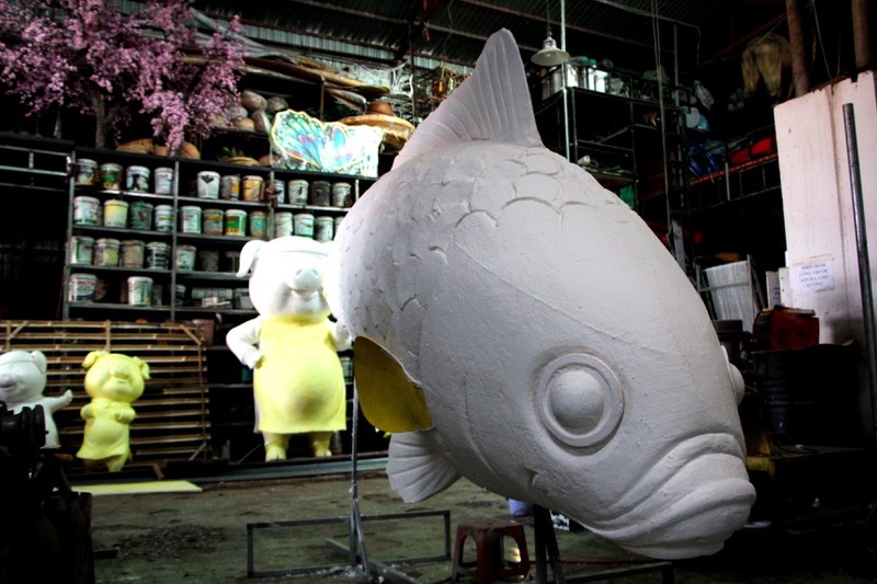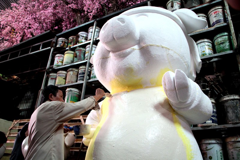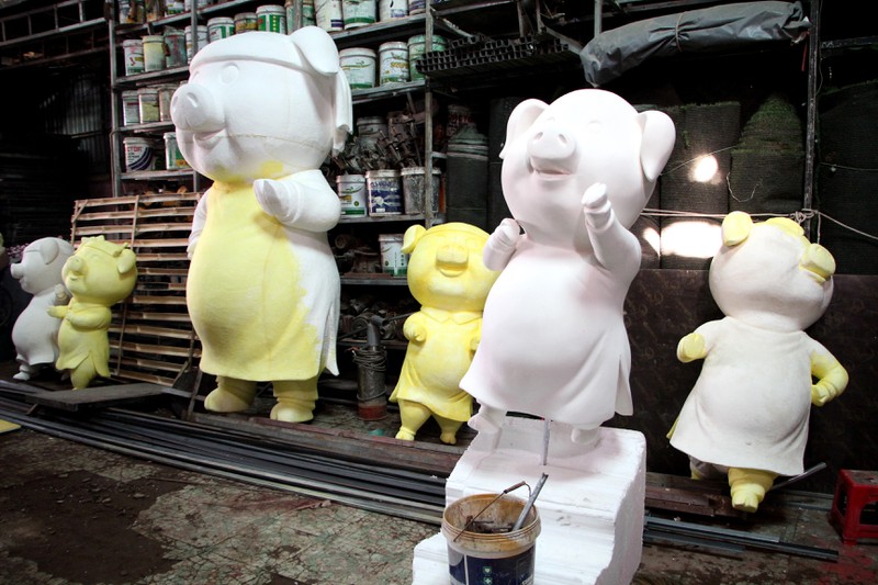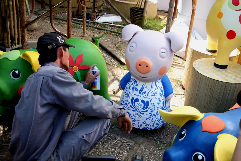 Tại xưởng của nghệ nhân Văn Tòng (quận 12), nhiều mẫu vật sẽ trưng bày tại đường hoa đang được các công nhân phun sơn hoàn thiện. Linh vật của đường hoa năm nay là gia đình heo với 2 heo bố mẹ và 7 chú heo con, ngoài ra còn có nhiều con vật khác thể hiện sự sung túc, no đủ trong năm mới. |