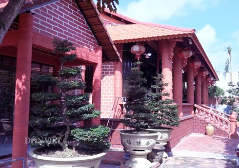 Ngôi nhà làm từ đất sét nung với kiến trúc nhà xưa Nam Bộ 3 gian, 2 chái. Nhìn từ xa, căn nhà gốm khá nổi bật với sắc đỏ tự nhiên của đất sét nung. Ảnh: M.A.