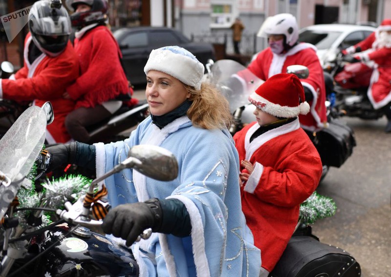 Một "bà già Noel" thích thú đạp xe giữa đường tuyết ở St. Petersburg, Nga. |