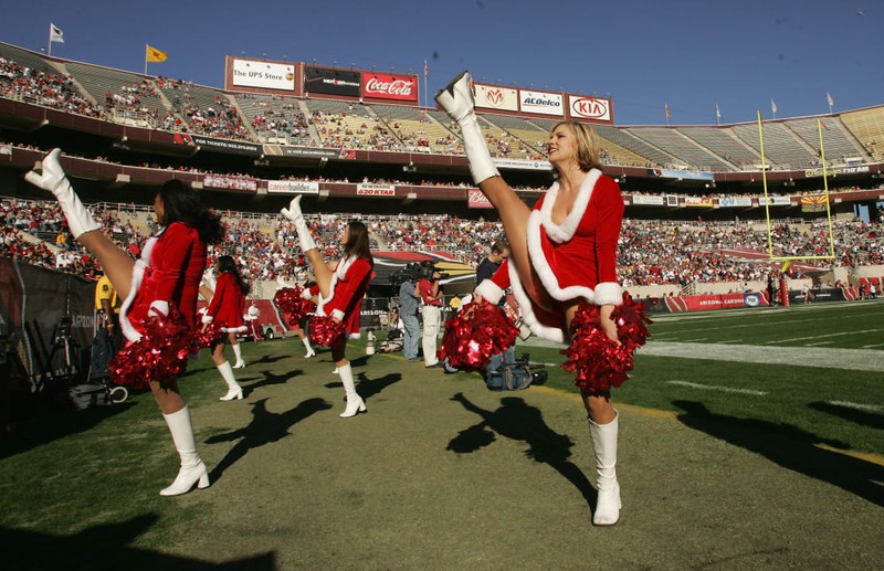 Các hoạt náo viên của đội bóng bầu dục Arizona trong trang phục Noel cổ động trước thềm trận đấu. |