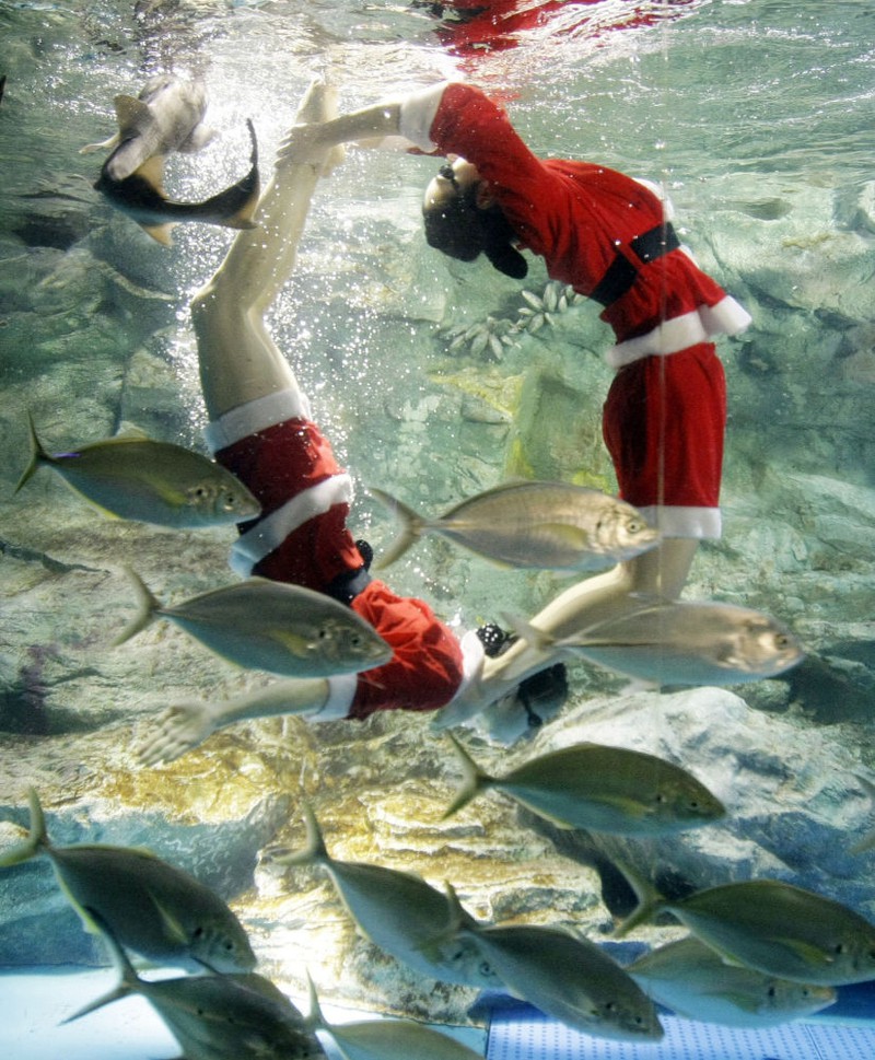 Đôi khi các bà già Noel còn xuống bơi cùng các chú cá như tại Thủy cung Seaworld Aquarium ở Seoul. |