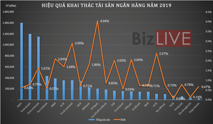 Tương tự, kết quả tại VietinBank cũng chỉ nhỉnh hơn BIDV chút xíu khi ROA trong năm 2019 chỉ đạt 0,79%, mặc dù ngân hàng này đứng thứ hai trong nhóm về tài sản.