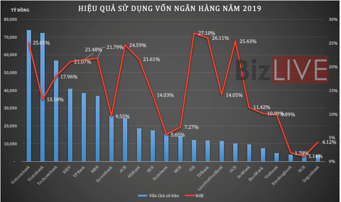 ACB, MBB, VPBank, BIDV, HDBank cũng là những ngân hàng có hiệu quả khai thác vốn khá tốt với ROE đều trên 20% trong năm qua.