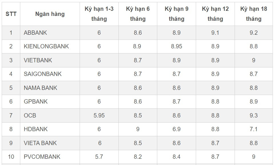 Tính đến thời điểm 20/3, lãi suất tiết kiệm online kỳ hạn 6 tháng cao nhất thuộc về KienLongBank (8,95%), trong khi ABBank và VietBank đứng thứ hai với 8,9%/năm.
