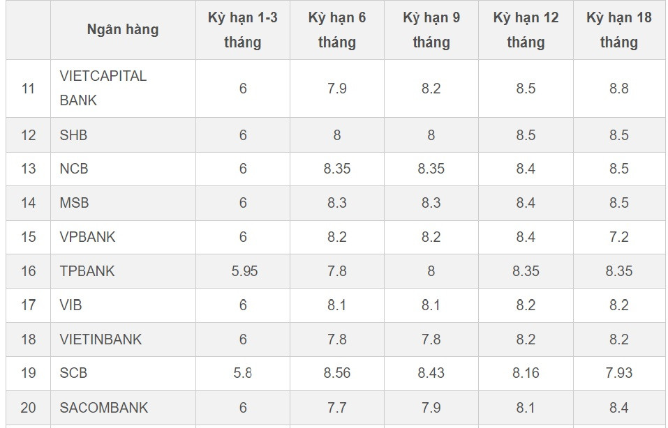 VietCapital Bank giảm mạnh lãi suất kỳ hạn 6 tháng từ 8,6% xuống 7,9%/năm, lãi suất kỳ hạn 12 tháng giảm từ 9% xuống 8,5%/năm.