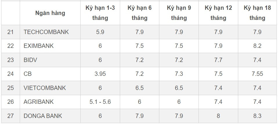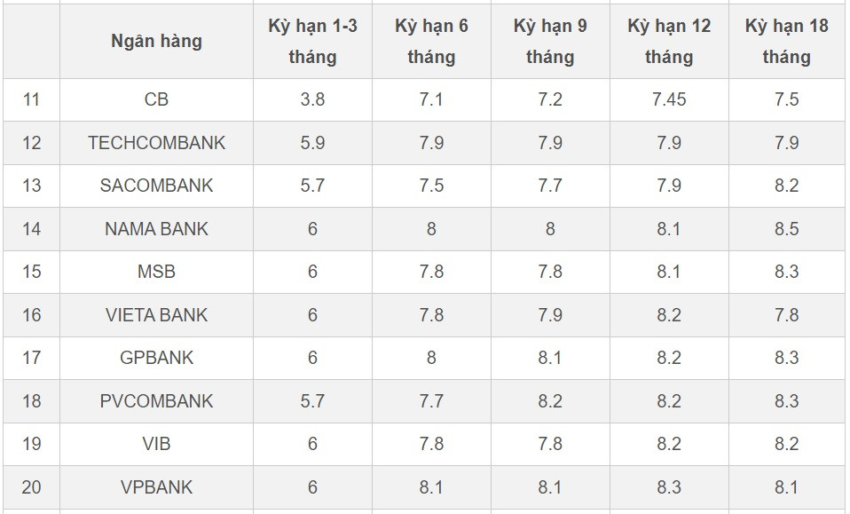 Trong khi đó, lãi suất tiết kiệm tại GPBank, OCB, MSB, PVCombank, VIB, Sacombank, Eximbank, CB, ABBank không có gì thay đổi.