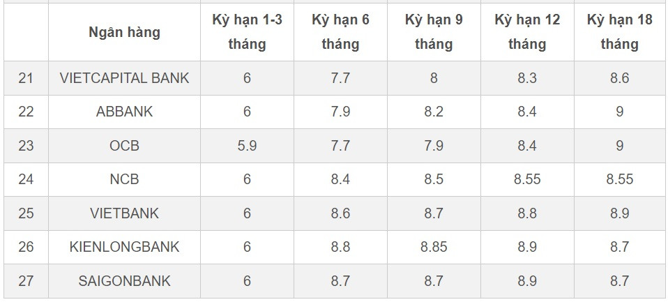 Bên cạnh nhóm Big4 Agribank, Vietcombank, Vietinbank, và BIDV, nhiều ngân hàng thương mại cổ phần cũng đã giảm lãi suất huy động như: VietBank, KienLongBank, VPBank, VietA Bank, NCB, VietCapital Bank, SHB, TPBank, SCB, HDBank,… trong đó một số ngân hàng giảm lãi suất huy động lần thứ hai trong vòng 10 ngày trở lại đây.