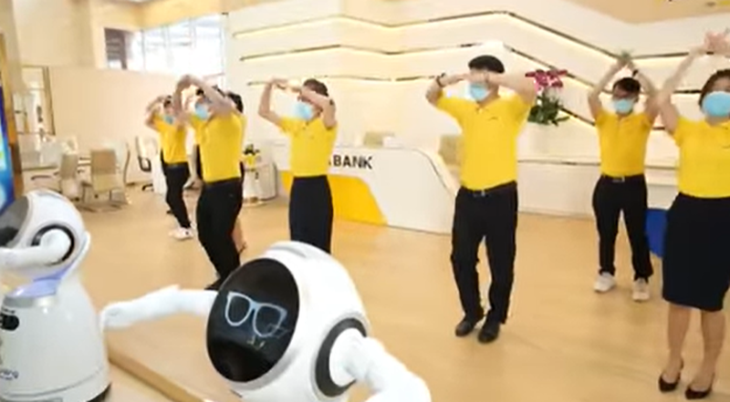 Tại Nam Á Bank, nhân viên nhà băng này còn nhảy "vũ điệu rửa tay" cùng với những con robot. Ảnh cắt từ clip. |