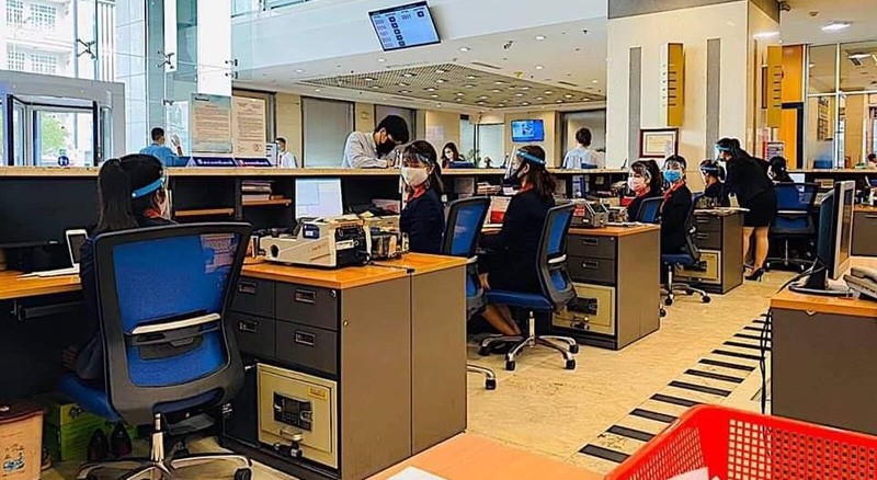 Tại quầy giao dịch của Sacombank, các giao dịch viên ngoài việc đeo khẩu trang còn có thêm kính chống dịch.Ảnh: FBVN. |